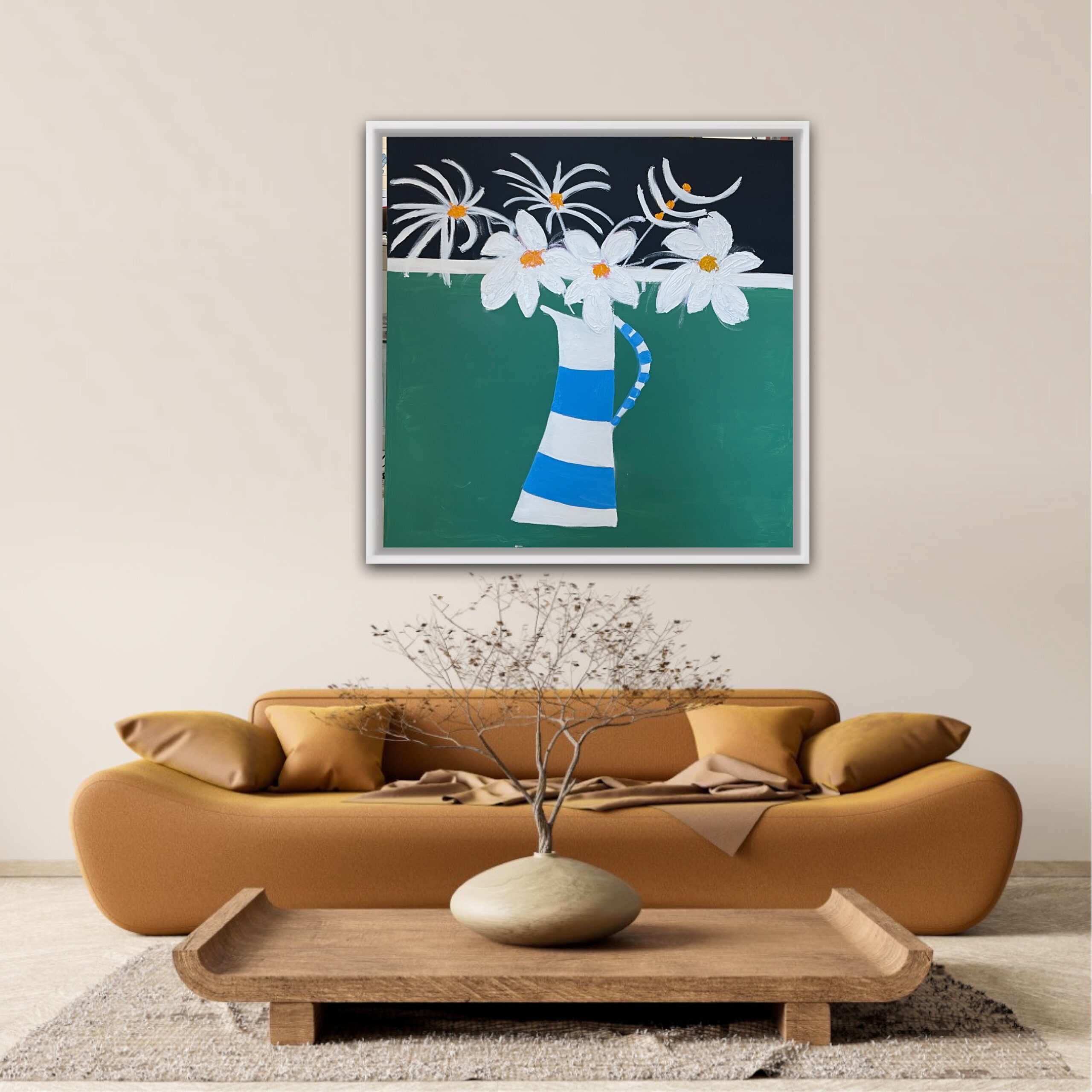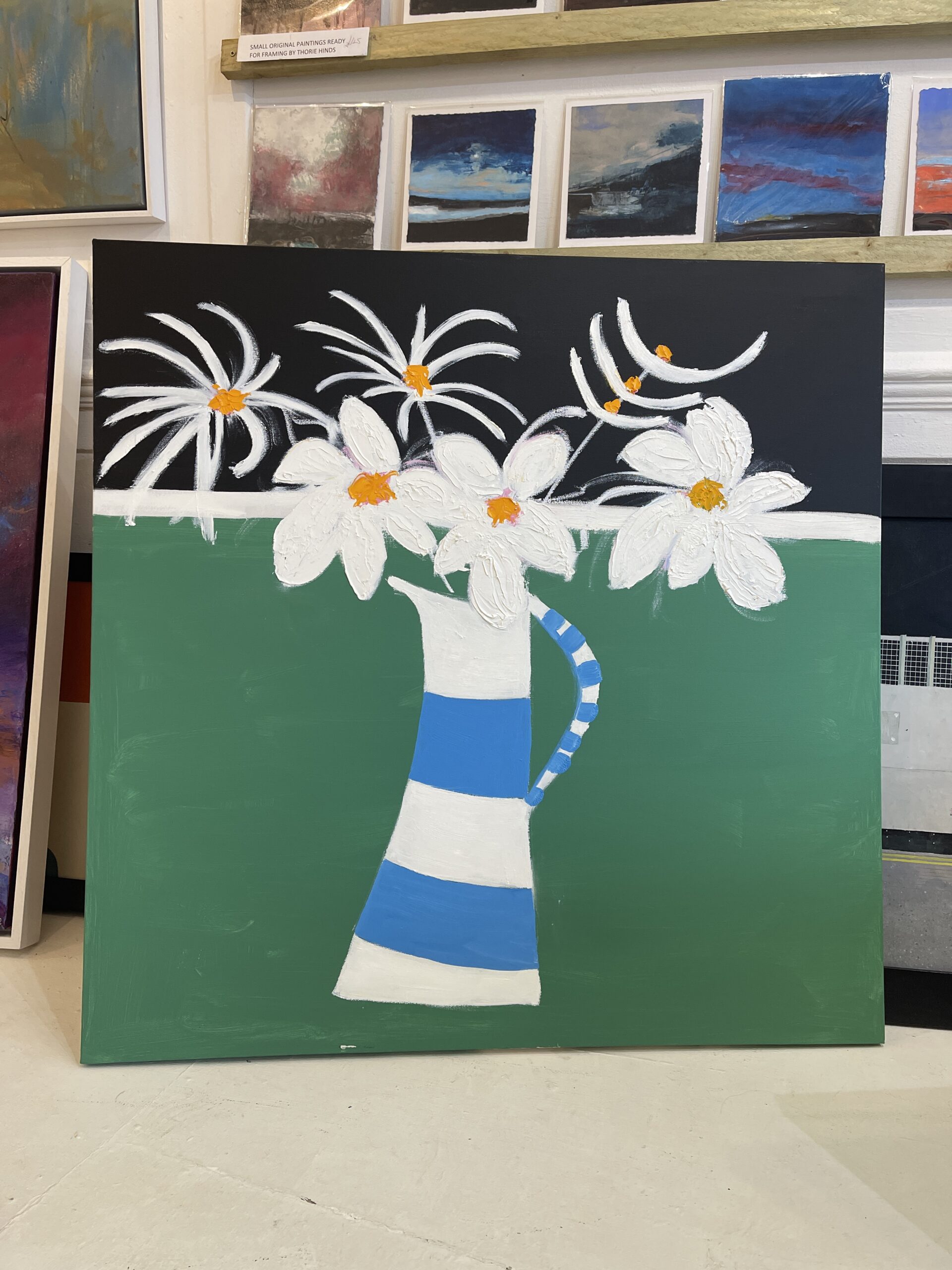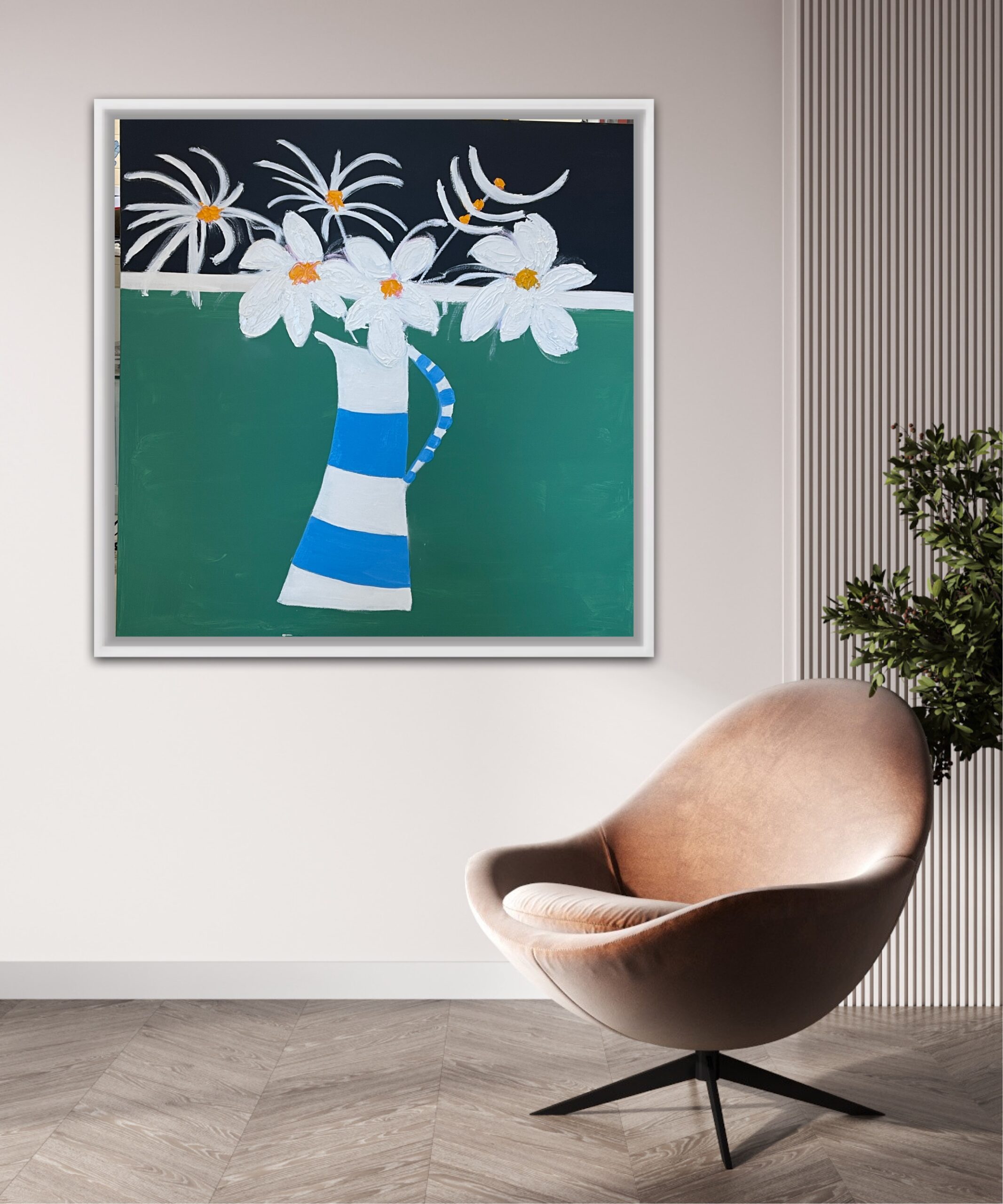 A great painting of a striped jug with white flowers. is framed, oil and acrylic on canvas, 106 cms SQ and £950