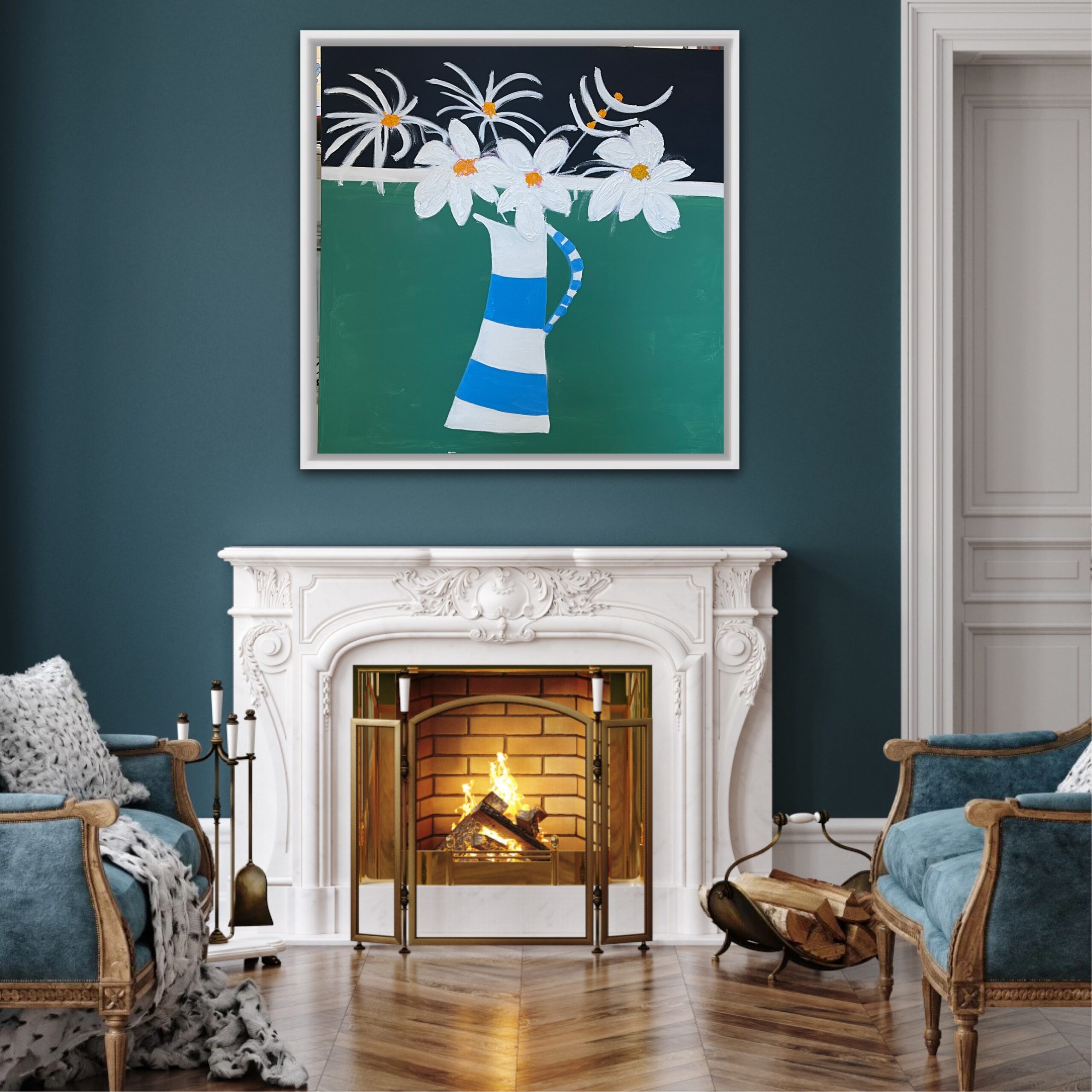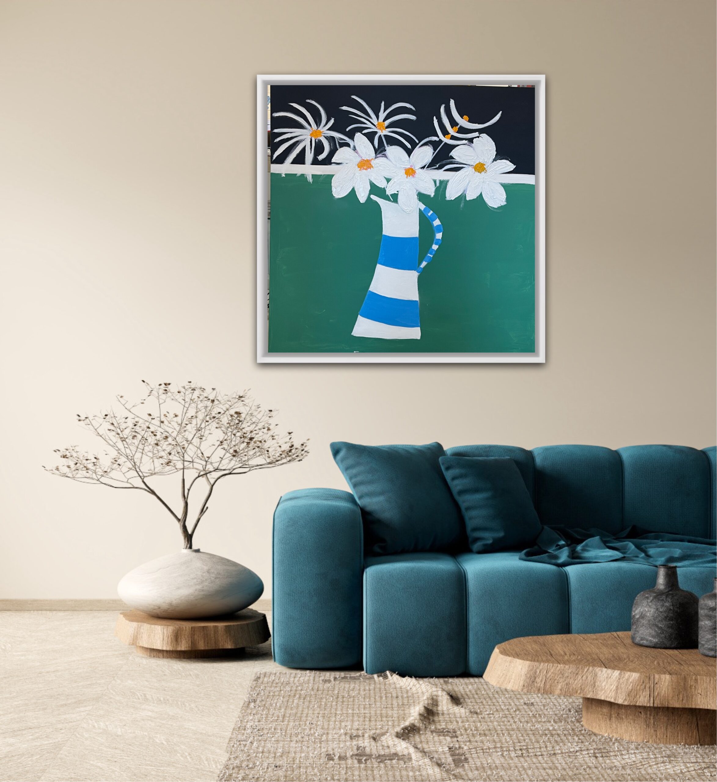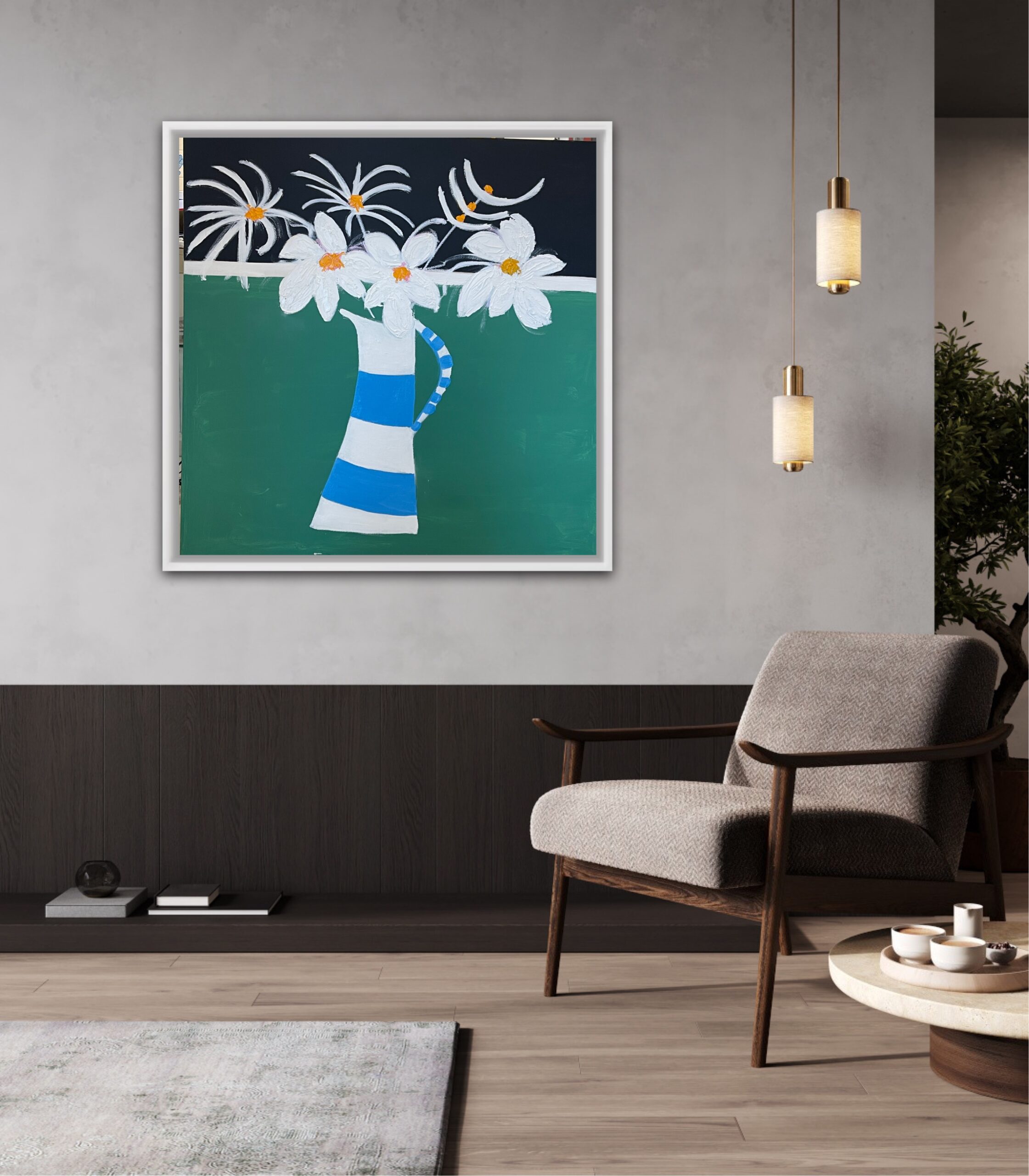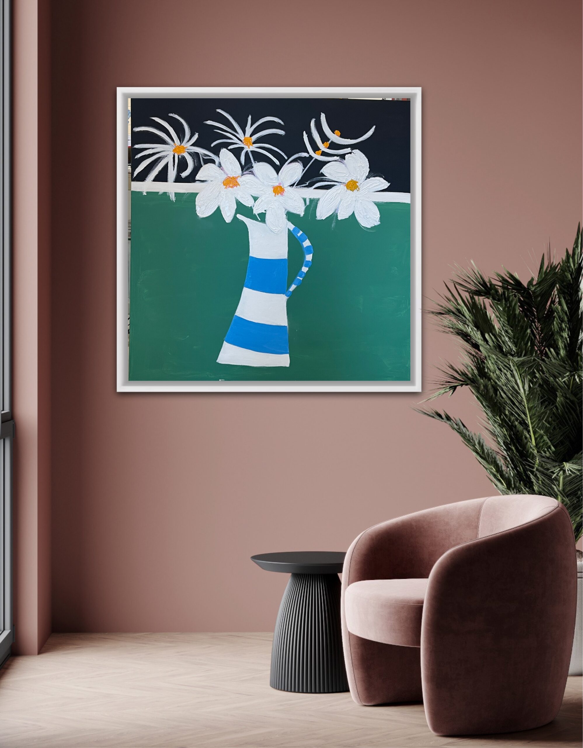 A great painting of a striped jug with white flowers. is framed, oil and acrylic on canvas, 106 cms SQ and £950