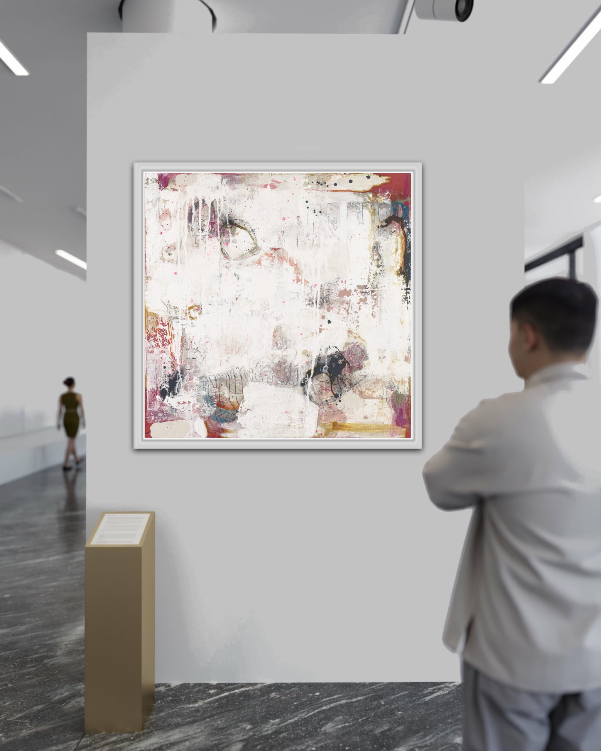This is 80 x 80 CMS plus frame so about 86 x 86 Wonderful contemporary abstract, with layers of applied paints and varnish giving a