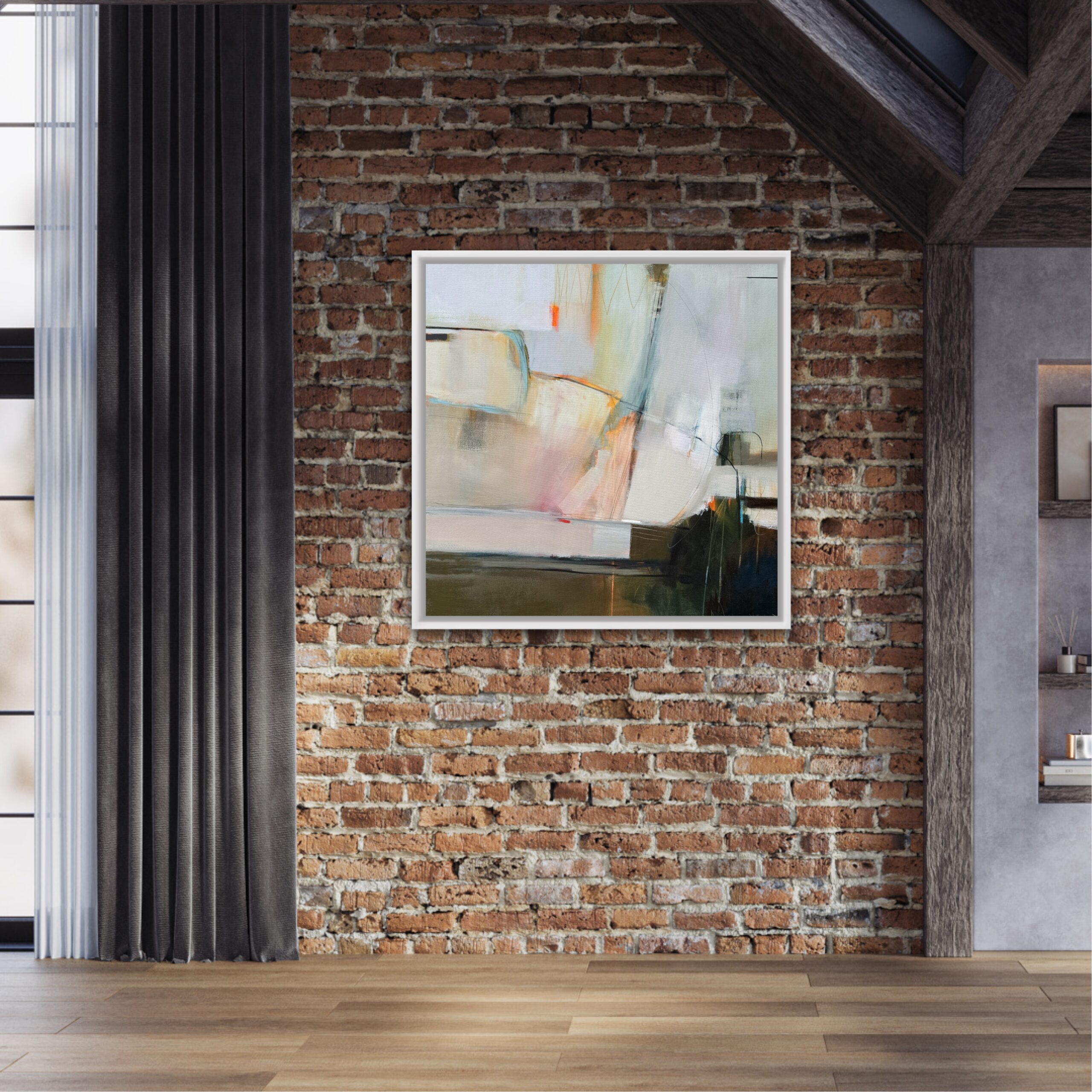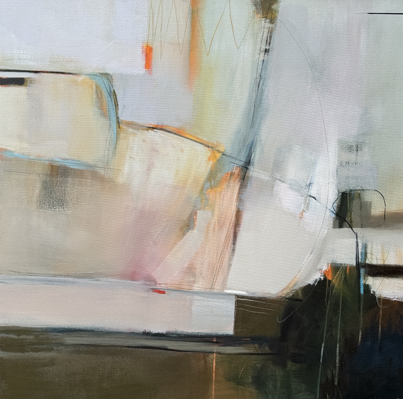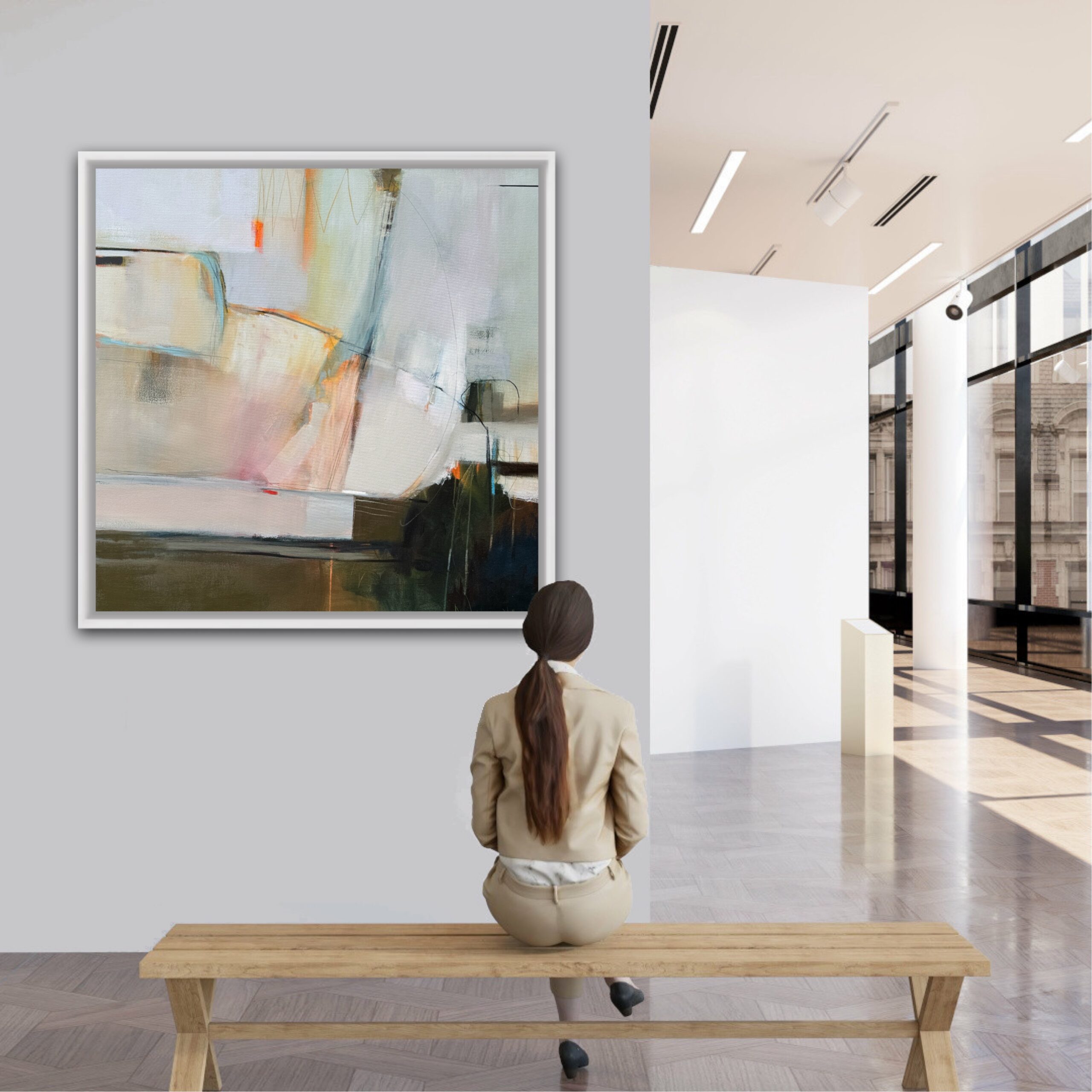 This is 104 cms, framed, a beautiful abstract painting in greys with a fabulous ping of orange. Camilla Clark delivers a great painting every time!