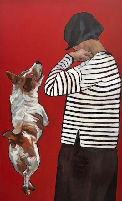 This is 60 x 97 cms plus frame dog jumping up and owner in striped top. A glorious red background